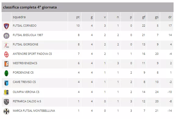 Il FUTSAL CORNEDO non cede la vetta, confermandosi capolista solitario con 10 punti. I vicentini si distinguono anche per un attacco atomico: sono la squadra con più reti segnate (22), una media impressionante di 5.5 gol a partita. A blindare il primato contribuisce anche la difesa, con sole 5 reti subite, rendendola la retroguardia meno battuta del campionato.