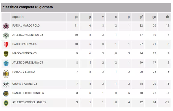 Perde terreno anche il CALCIO PADOVA C5 di mister Valso Stefano che per in Friuli contro il MACCAN PRATA di mister Pillon Renzo per 7 a 2: Thierry Manzali tiene in vita gli ospiti, ma le triplette di Zanussi Leonardo e Vidali Noè oltre al gol di Khalil Adam indirizzano la gara.