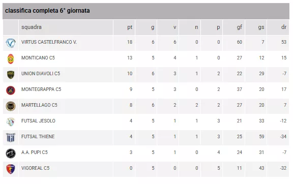 Nel Girone PROMOZIONE continua la corsa solitaria della VIRTUS CASTLFRANCO di mister Miranda Pablo che vince per 20 a 0 contro il FUTSAL THIENE di mister Villivà Fabio. Cinquine per Merlo Rocco e El Mouadane Zakaria, tripletta per Berton Marco, doppietta per Costa Edoardo, reti anche per Tieppo Bernardi Pierpaolo, Todaro Alan Alessandro, Omodei Marco, Bertolo Nicola e Bragagnolo Lorenzo. Porta inviolata per Scapolo Lorenzo e Zacchello Davide.