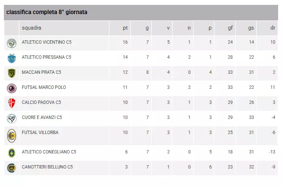 L'ATLETICO VICENTINO C5 mantiene la vetta con 16 punti, ma l'ATLETICO PRESSANA C5 resta in scia a quota 14. Più staccate le altre formazioni, che però dimostrano una vitalità offensiva notevole, come dimostrato dai tabellini di questa giornata.