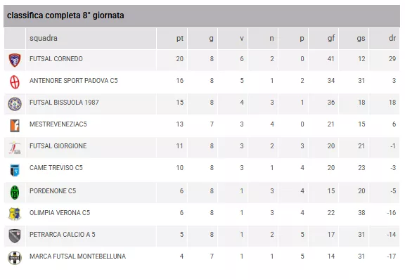 Il FUTSAL CORNEDO mantiene il comando con 20 punti e l'imbattibilità intatta. L'ANTENORE SPORT PADOVA C5 (16 pt) consolida il secondo posto grazie a un attacco ispirato, seguita dal FUTSAL BISSUOLA 1987 (15 pt) che si conferma squadra ostica per chiunque. Il MESTREVENEZIAC5, pur avendo una gara in meno, resta in piena zona Finali Regionali con 13 punti.