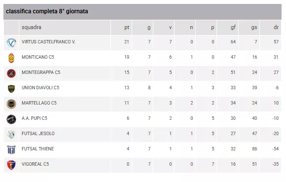 La VIRTUS CASTELFRANCO V. guida a punteggio pieno con 21 punti, seguita a ruota dal MONTICANO C5 a quota 19. Entrambe le squadre sono ancora imbattute, ma la Virtus vanta una differenza reti mostruosa di +57. Il MONTEGRAPPA C5 consolida il terzo posto con 15 punti.