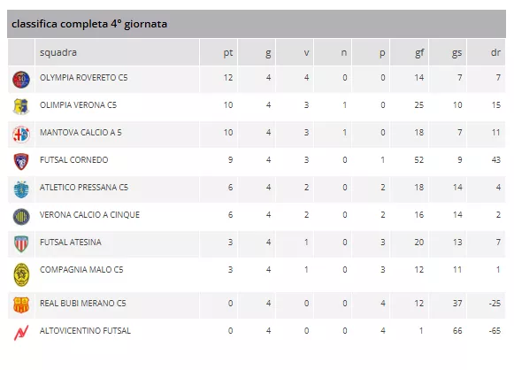 La 4ª giornata di campionato UNDER 19 Gir. C regala un colpo di scena in vetta e uno show assoluto del FUTSAL CORNEDO. L'OLYMPIA ROVERETO C5 sfrutta il passo falso dell'OLIMPIA VERONA C5 e MANTOVA CALCIO A 5 issandosi in testa alla classifica a punteggio pieno.