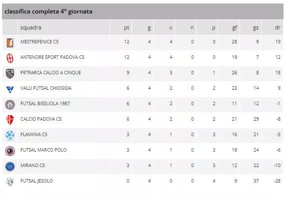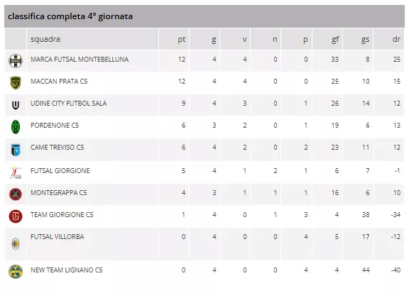 La 4ª giornata ha riservato grandi emozioni nel Girone E, con la vetta della classifica ora occupata da un tandem di squadre a punteggio pieno. Il MARCA FUTSAL MONTEBELLUNA e il MACCAN PRATA C5 si staccano dal resto del gruppo, mentre la CAME TREVISO C5 subisce un duro colpo, perdendo in casa.