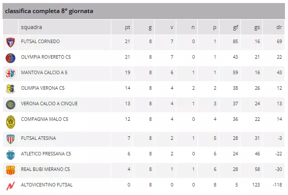 L'ottava giornata del Campionato Under 19 Girone C ha regalato uno spettacolo pirotecnico e, in vetta, una lotta serrata per la Fase Nazionale. Le prime quattro posizioni, valide per i Play Off Scudetto, sono il teatro di un duello mozzafiato, con il FUTSAL CORNEDO che consolida la sua leadership come la squadra con più reti segnate (85 gol fatti) e, in coabitazione con il MANTOVA CALCIO A 5, come la squadra con meno reti subite (16 gol subiti).