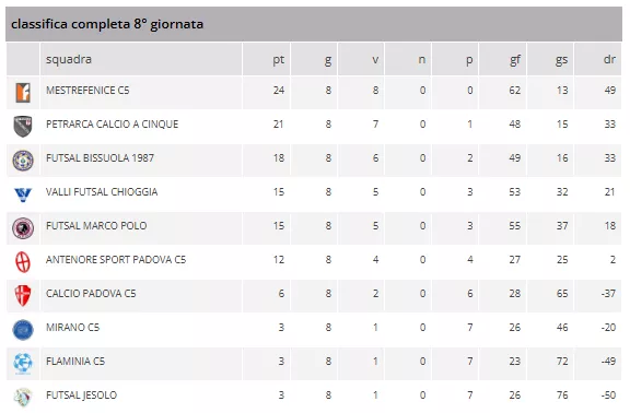 Il MESTREFENICE C5 (24 punti) si conferma l'indiscussa dominatrice del girone, non solo a punteggio pieno, ma vantando il primato di squadra con più reti segnate (62 gol fatti) e, contemporaneamente, con meno reti subite (13 gol subiti).