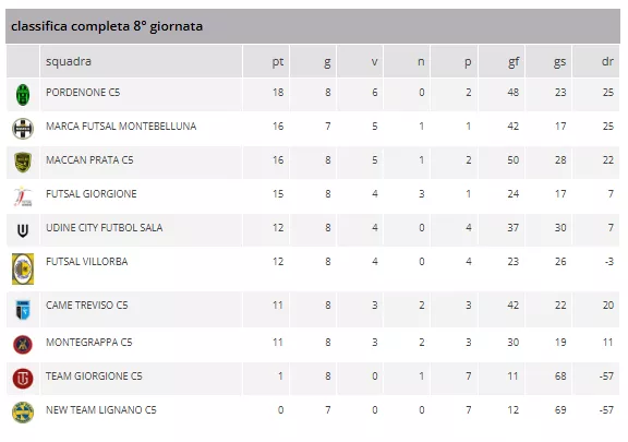 In vetta, il PORDENONE C5 (18 punti) ha subito un inatteso stop casalingo, perdendo l’imbattibilità nel suo PalaFlora di Torre Pordenone (PN) contro il FUTSAL GIORGIONE (15 punti), 3 a 6 il risultato finale (Primo Tempo: 2 a 3). I gol del PORDENONE C5 sono stati realizzati dal capocannoniere Morson Filippo, Corona Marco e Zanolin Enrico, con Tranquillo Marco in porta. Mister Bearzi Andrea. Per il FUTSAL GIORGIONE, il Mister Robson Angelo e Redi Halimi al suo quinto risultato utile consecutivo, hanno visto le doppiette di Doretto Eduardo e Rickelmy Caua Batista De Lima, e i gol di Dos Santos Gasparetto Gabriel e Bernardi Leonardo. Arbitri: Zandegiacomo Copetin Marco (Udine) e Biscontin Alessandro (Pordenone).