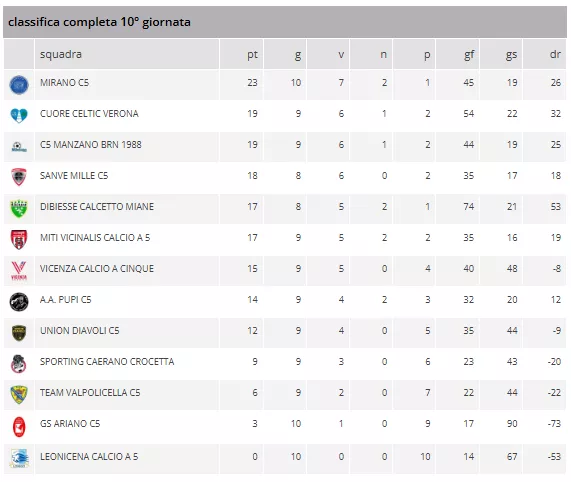 Subito dietro, in coabitazione a 19 punti con il C5 MANZANO BRN 1988 (che ha osservato il turno di riposo), si posiziona il CUORE CELTIC VERONA. I veronesi vincono il big-match di giornata superando il DIBIESSE CALCETTO MIANE per 4 a 2, dimostrando grande determinazione nel rimontare un inatteso svantaggio iniziale di 0 a 1 nel Primo Tempo. Sotto la sapiente guida di Mister Cacciatori Riccardo, i gol della rimonta portano la firma della doppietta di Costantini Alessandro, di Novara Leonardo e di Ginco Daniel. Il DIBIESSE CALCETTO MIANE (17 punti e forte del miglior attacco del campionato con 74 reti segnate), di Mister Ait Ceichk Yousef e Goudadi Youseff, è andato a segno con Shala Ardian e il capocannoniere Grishay Aurelio, ma non è bastato per frenare lo slancio avversario. Arbitro: Denis Montano della sezione AIA di Verona.