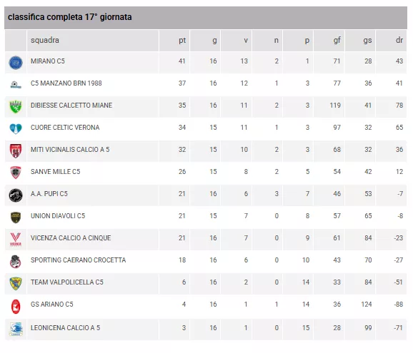Il MIRANO C5 (41 pt) tiene il comando, ma i friulani del C5 MANZANO BRN 1988 (37 pt) e i trevigiani del DIBIESSE CALCETTO MIANE (35 pt) non mollano la presa. Con i veronesi del CUORE CELTIC VERONA (34 pt) che devono recuperare una gara, la corsa al titolo regionale è più aperta che mai. Nella parte bassa, lo SPORTING CAERANO CROCETTA (18 pt) respira, mentre l'ARIANO (4 pt) e la LEONICENA (3 pt) restano in fondo a una classifica ma, che non mollano mai nei 60 minuti disputati.