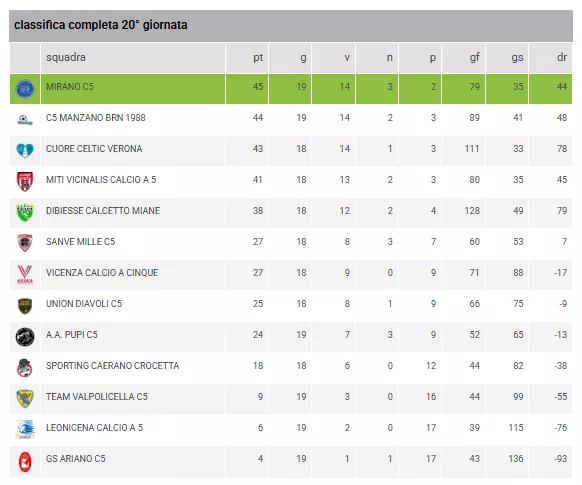 La classifica a sei giornate dalla fine vede il Mirano C5 (45 pt) in pole position, ma il fiato sul collo del Manzano (44 pt) e del Cuore Celtic Verona (43 pt) si fa sentire. I veronesi, con una gara da recuperare, sono potenzialmente i favoriti virtuali grazie a una differenza reti monstre (+78) e a una difesa che concede pochissimo. Il Vicenza Calcio a Cinque, rimasto ai box per il turno di riposo con Mister Dal Maso Mauro, osserva una lotta al vertice che promette scintille fino all'ultimo secondo dell'ultima giornata.