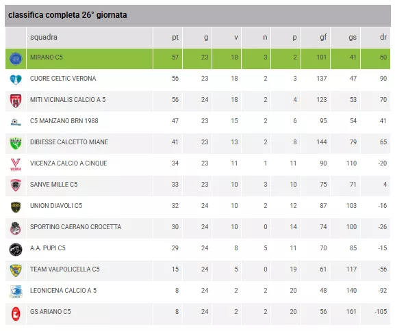 La Classifica alla 26ª giornata: Una polveriera. Il MIRANO C5 comanda a quota 57, ma sente il fiato sul collo di CUORE CELTIC VERONA e MITI VICINALIS, pronti al sorpasso a un solo punto di distanza (56).