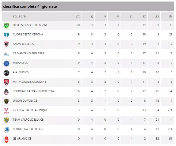 In questa giornata ha osservato il turno di riposo il CUORE CELTIC VERONA di Mister Cacciatori Riccardo unica squadra assieme al SANVE MILLE C5 ad aver vinto tutte le partite giocate.